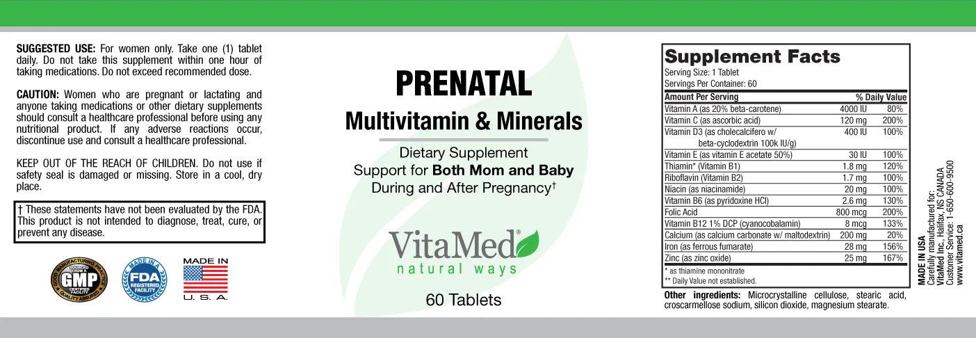 VitaMed’s Prenatal Multivitamin & Minerals is used for treating or preventing a lack of vitamins or minerals before, during, and after pregnancy and while breast-feeding. It may also be used for other conditions as determined by your physician.