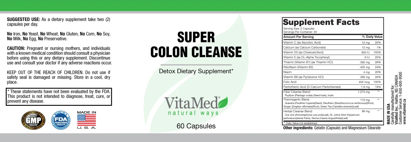VitaMed’s Super Colon Cleans is a natural blend of Fiber, Thermogenic, and Herbal cleanse.